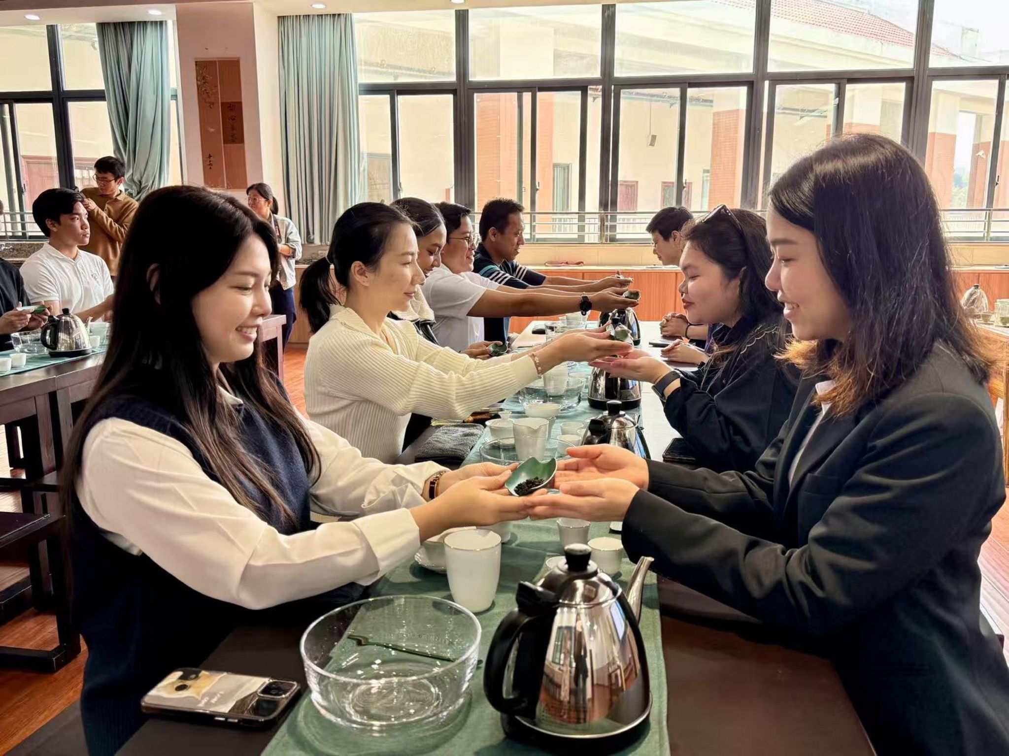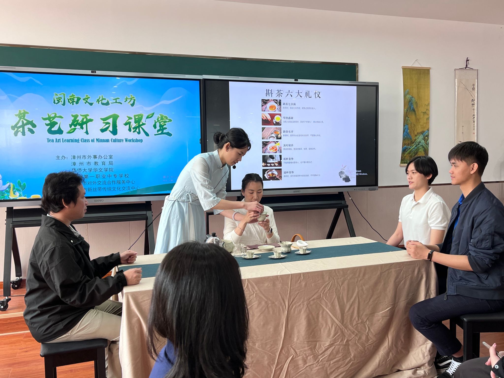 研修班围绕“明茶理、修茶技、传茶情”三大模块展开,邀请国家二级茶艺技师、漳州一职校茶艺教师戴佳辉等专家进行授课。理论课内容丰富,从中国六大茶类概论到闽南茶精讲,从漳州茶的独特工艺到闽南茶道礼仪,专家们带着留学生从中国茶史出发,通过展示各个时代的茶叶、茶艺及茶礼,叩响千年茶韵之门。“我知道,中国的茶祖是神农。”“中国的茶圣是陆羽。”在中国学习了5个月中文的柬埔寨官员班学员何义先认真做着笔记,抢答问题。拿到老师送的小茶礼,他非常高兴:“之前我不知道怎么泡茶,这下可以学到真的功夫了。”