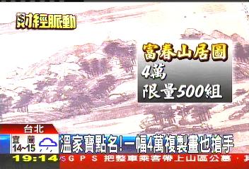 中新网4月24日电 据台湾TVBS报道,2010台北礼品展开跑,台北故宫今年第3次参展,也是规模最大一次。此次台北故宫特别把温家宝提过的富春山居图制作成复刻板,限量500套,虽然一幅4万元(新台币,下同),但一开卖就被订走50套。