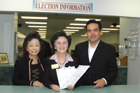 赵谭美生(中)在黄赵企晨(左)和Estrada的陪同下登记参选第32选区联邦众议员。(美国《星岛日报》资料图/丁曙 摄)