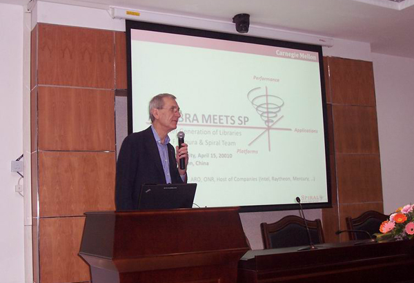 José M. F. Moura 教授在报告中就智能信号处理的研究现状作了阐述,重点介绍了 Spiral 方法,这种方法可自动生成高质量代码,并行运行于多核系统中,提高编程效率及改进硬件执行效率。目前,已有许多硬件平台产品支持 Spiral ,如 IBM 的 Blue Gene 等。