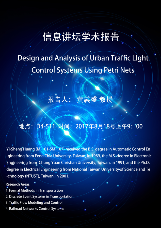 信息讲坛学术报告:黄羲盛《Design and Analysis of Urban Traffic Light Control Systems Using Petri Nets》
