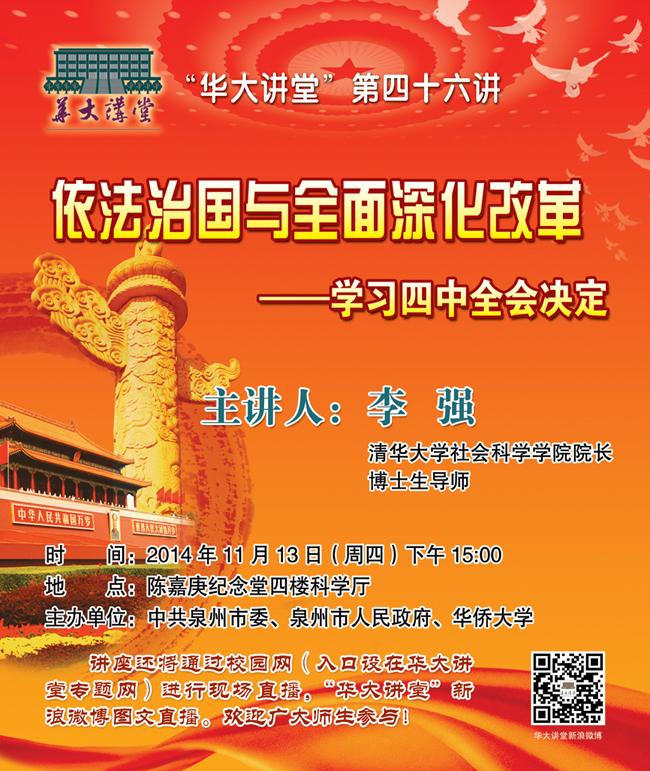 预告:“华大讲堂”第46讲:清华大学社会科学学院院长、博士生导师李强《依法治国与全面深化改革——学习四中全会决定》