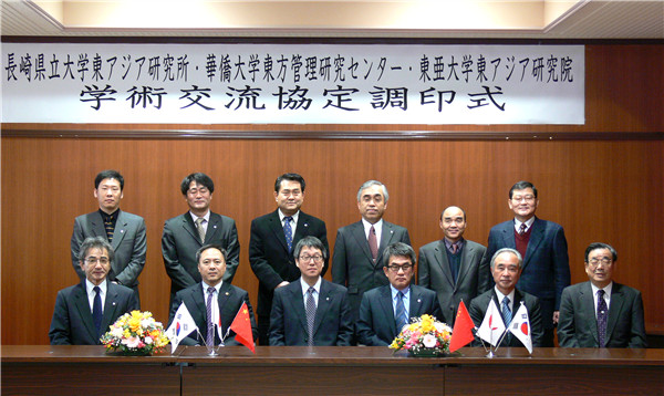日前,赴日参访的校长助理曾路教授代表sjb世俱杯官方网站东方企业管理研究中心在日本与日本长崎县立大学东亚研究所和韩国东亚大学东亚研究院共同签署了东亚区域经济研究中、日、韩三方合作协议。