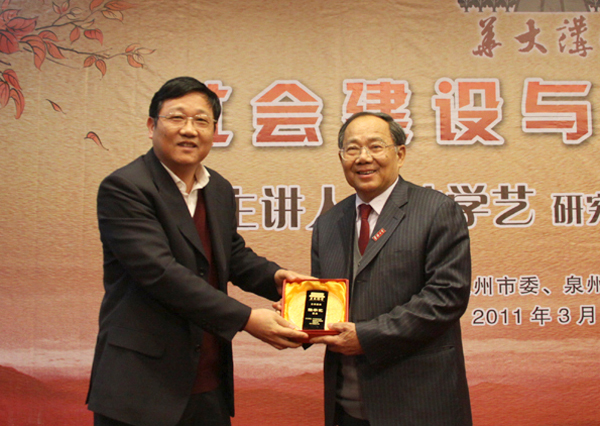 泉州市政协主席杨俊峰向陆学艺教授颁授“华大讲堂”主讲嘉宾纪念牌